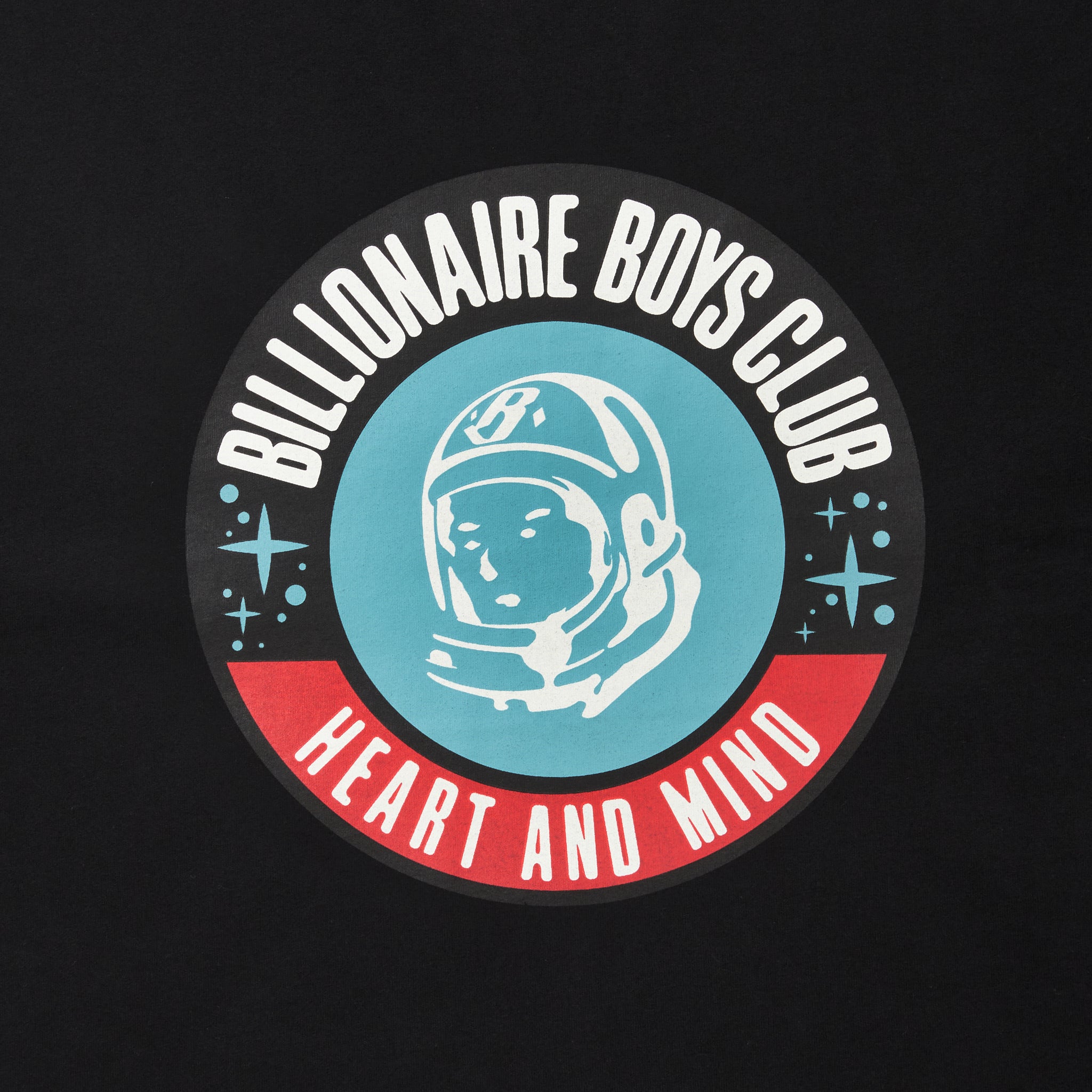 フロントにはヘルメットをかぶったアイコニックなキャラクターを中心に、「BILLIONAIRE BOYS CLUB」のロゴと“HEART AND MIND”のメッセージを円形に配置。