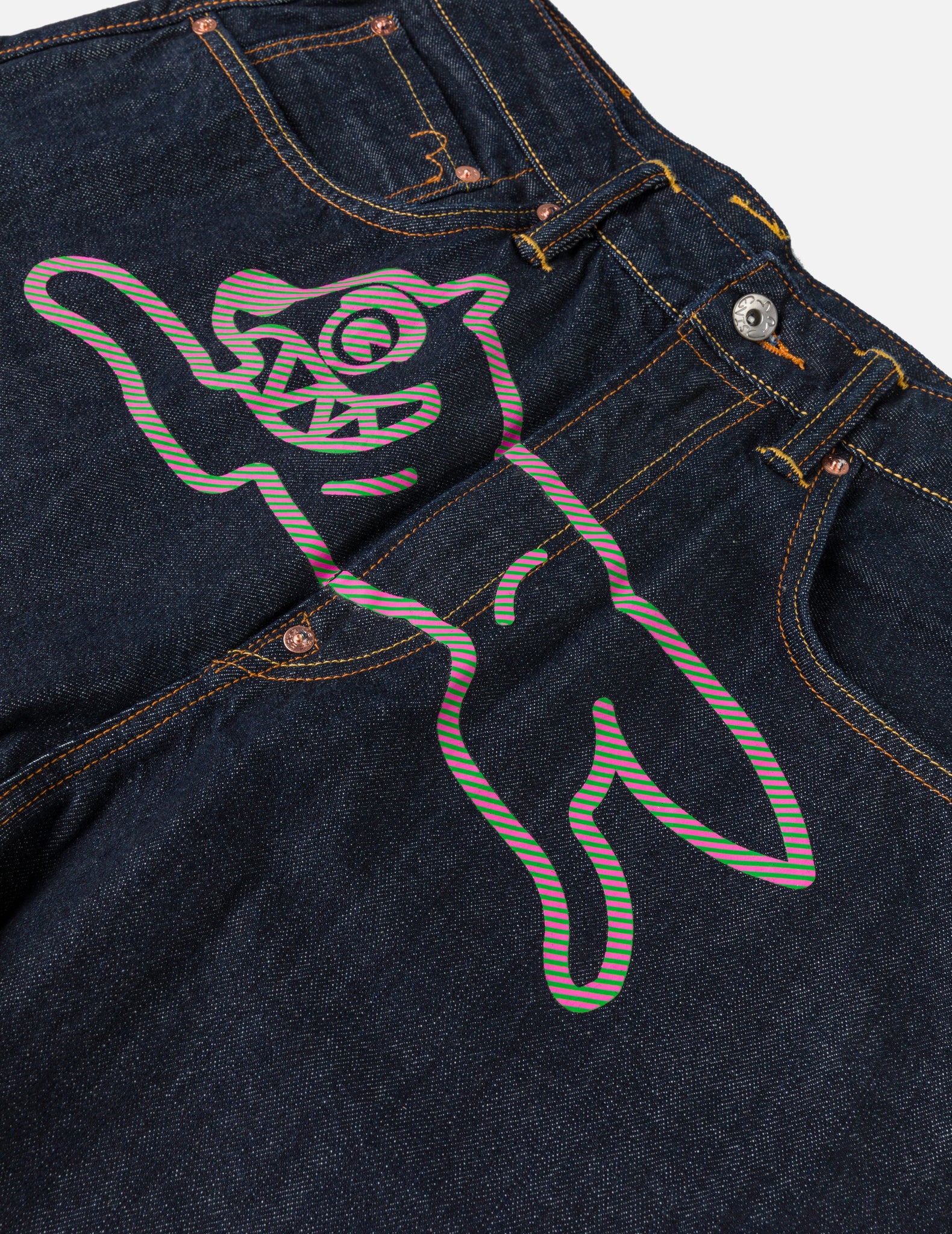 バックに象徴的なDaicockプリントを施したバギーデニムジーンズ。