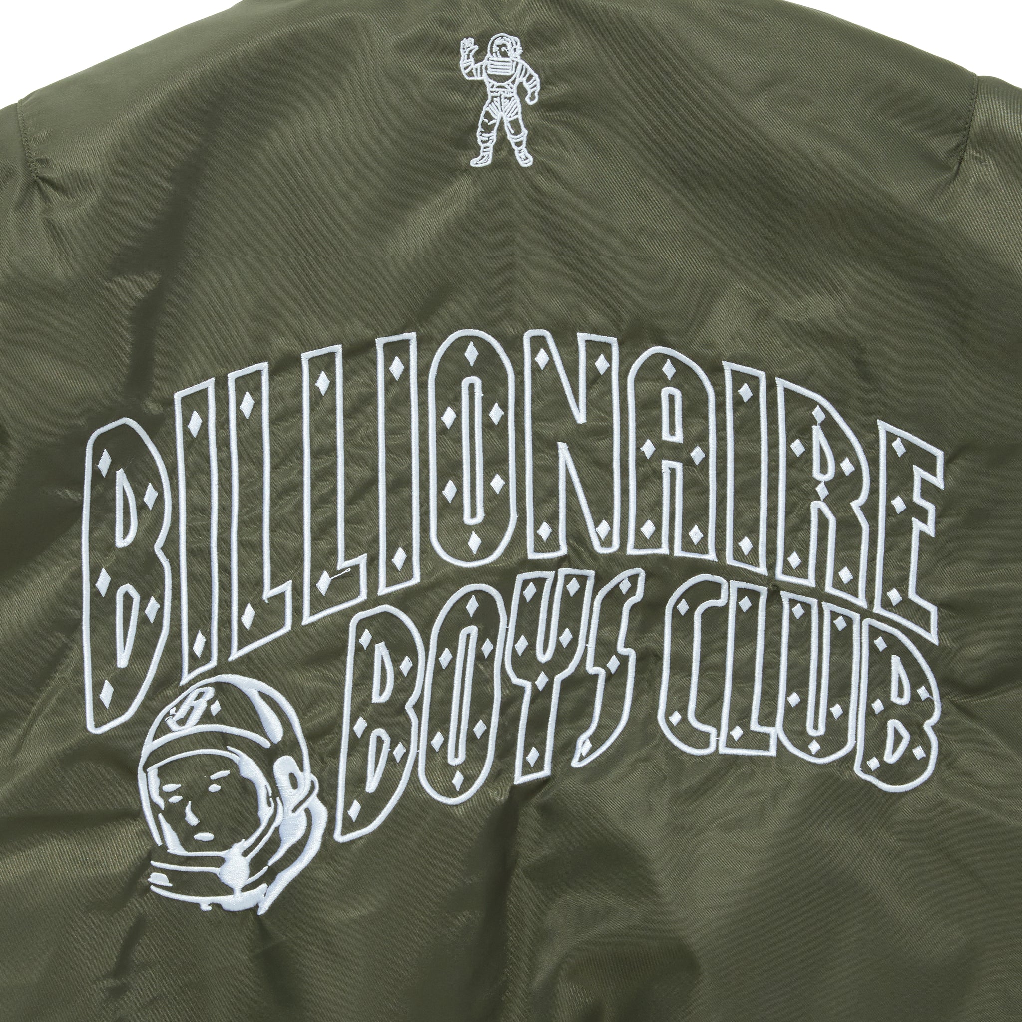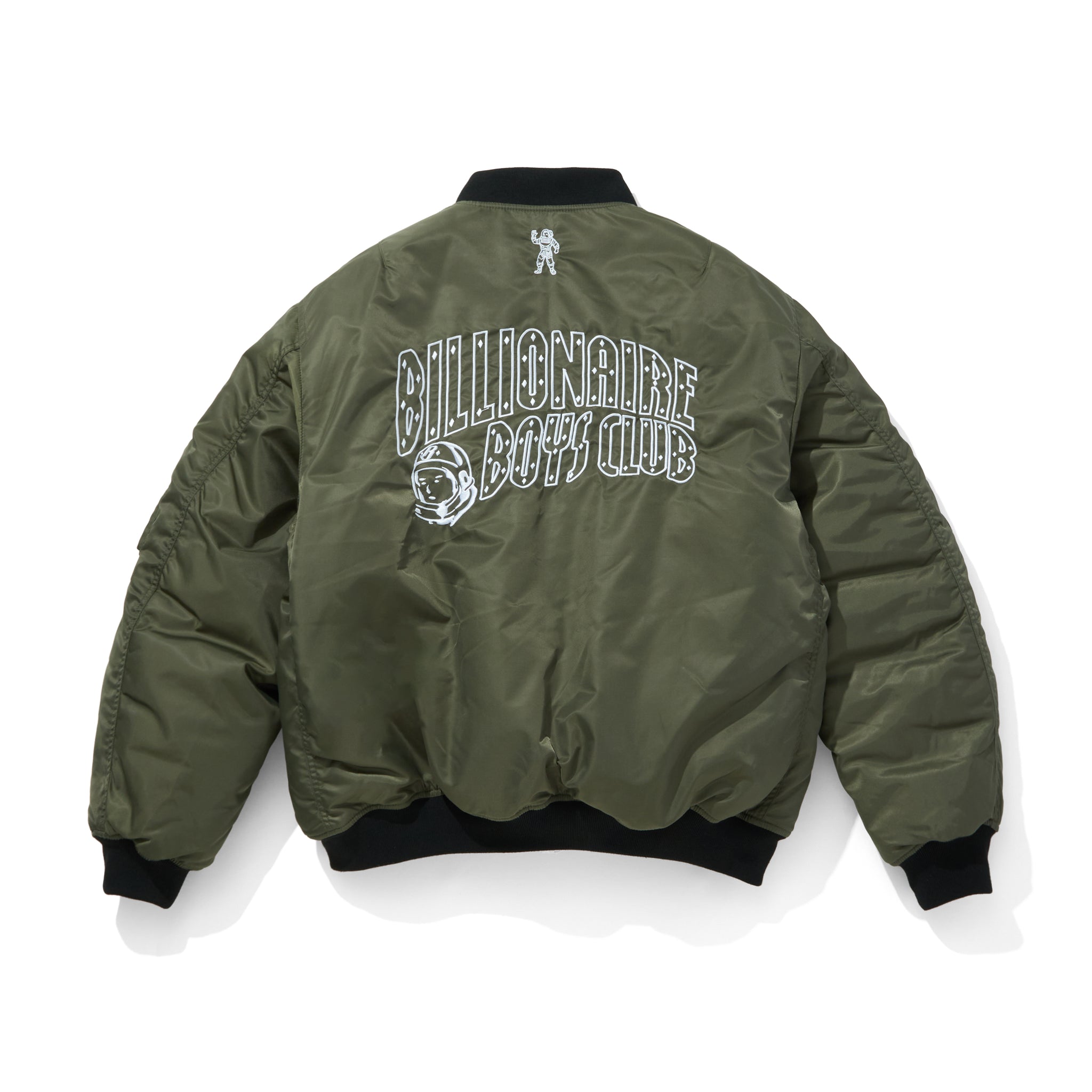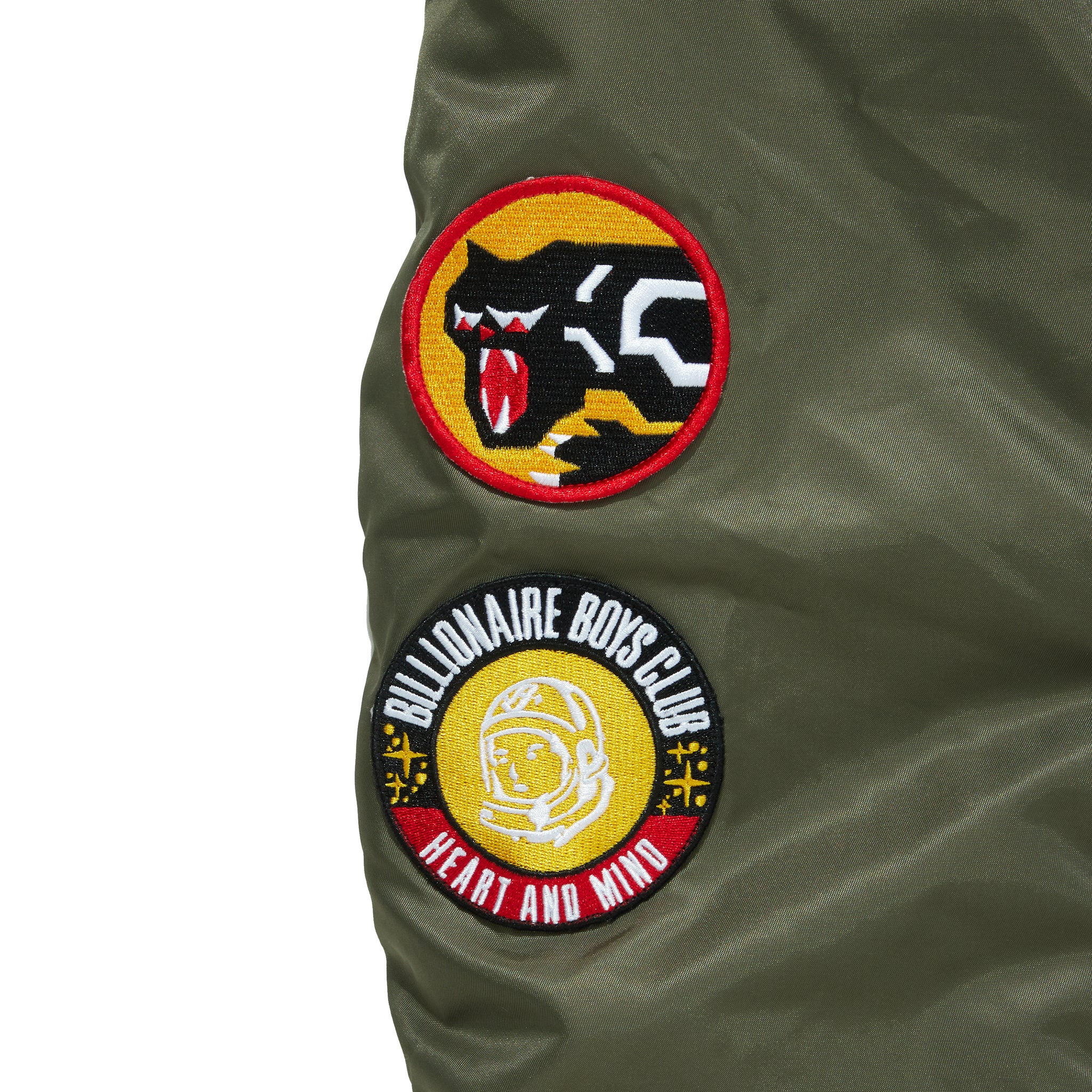 光沢感のあるナイロンボディに、ブランドを象徴するスペースヘルメットロゴワッペンを配置。さらにスリーブや胸元にはオリジナルワッペンを複数レイアウトし、存在感のあるデザインに仕上げています。